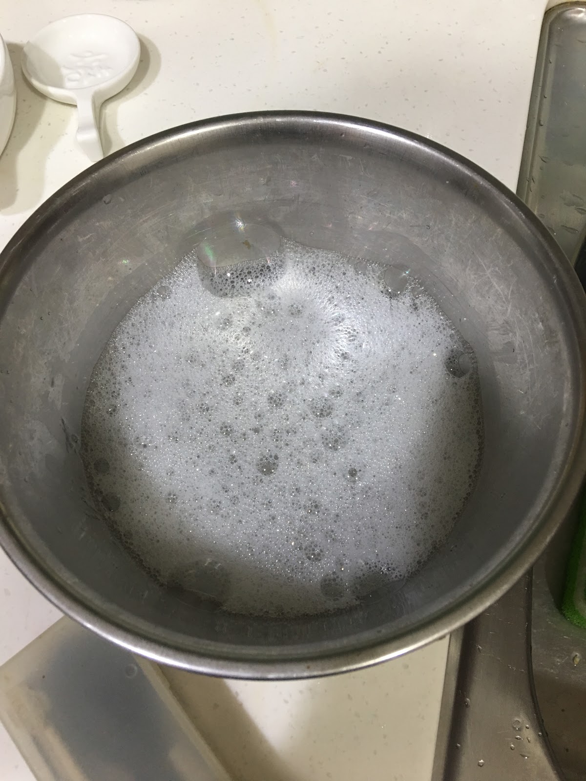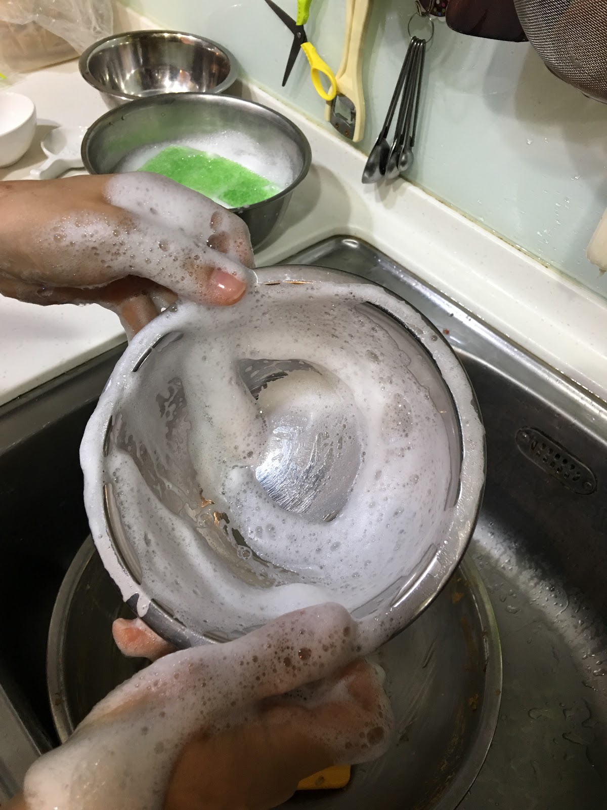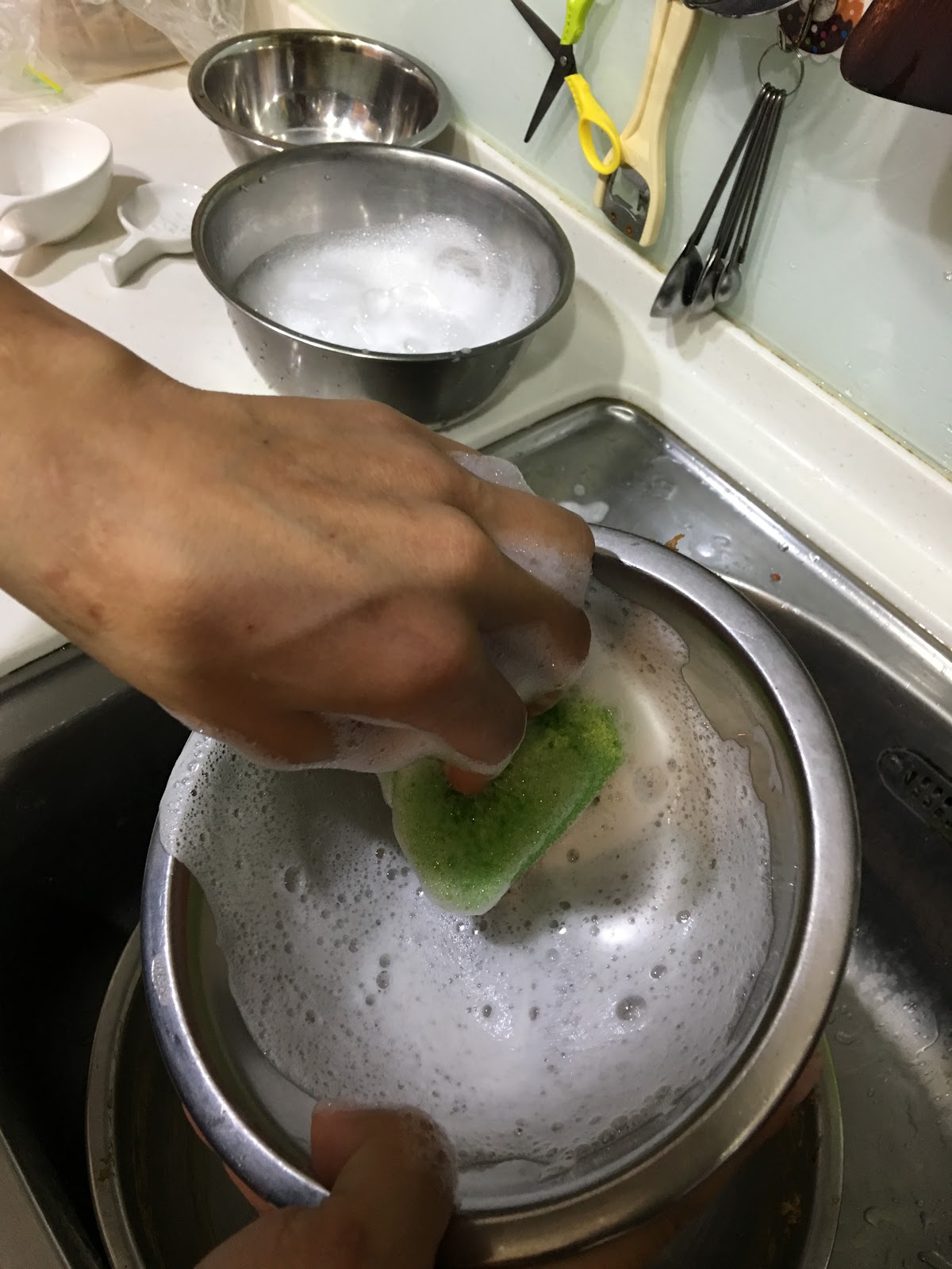 接下來就..洗碗(這是秤量過沙拉油的鋼盆),用海綿菜瓜布沾稀釋過的洗潔液,刷洗碗盤,順時針抹個兩圈。(逆時針也可以) 不要忘記碗屁股也要洗。